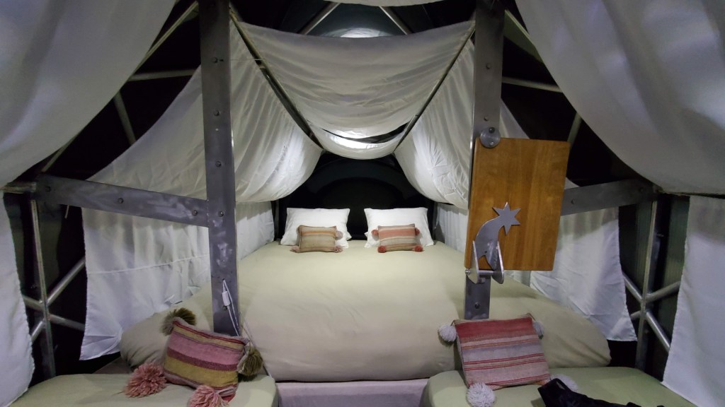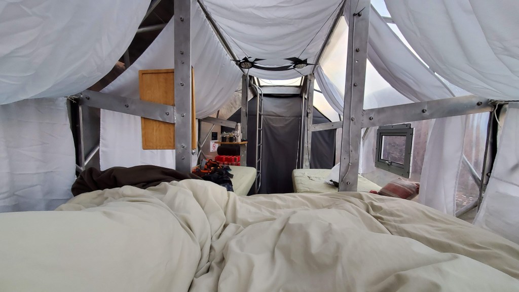 The pods themselves are extremely comfortable with a queen bed and 2 twins in each. There are curtains for every window for privacy and plenty of lighting for the night. Behind the black door in the picture below was the bathroom which included potable water from a jug to use for hand washing, toothbrushing, and water bottle refills. The toilet system was also pretty clever — there was a toilet and sink in the bathroom and there were tubes in the same area for dumping waste cleanly down to their collection area at the bottom of the mountain.