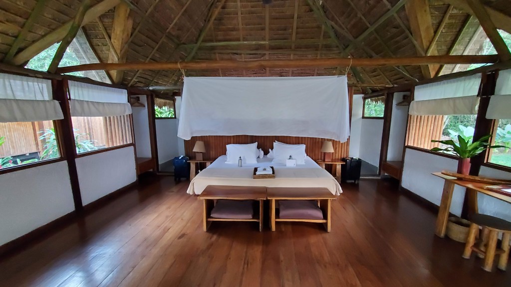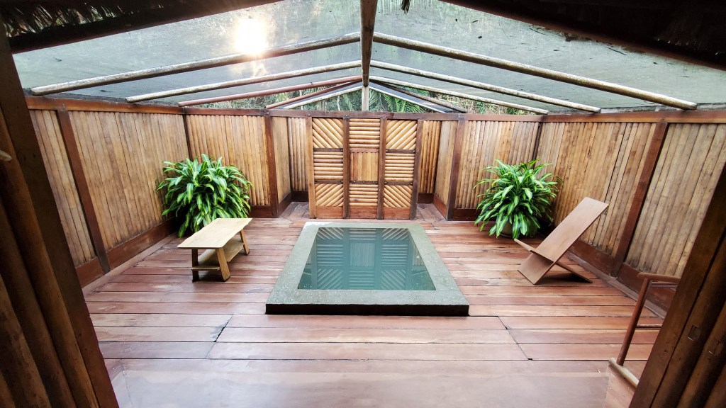The cabanas themselves are beautiful! Each has a set of hammocks, bed, and bathroom area. We splurged to also get the larger Tambopata Suite with a private cold dip pool and extra shower area, which honestly was worth it in the amazonian heat. This suite will however run you about $670 per night.