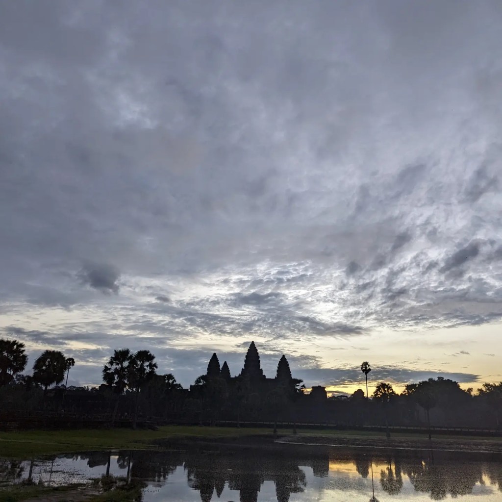 Once I was well enough to be carted around to some temples we embarked on a two day guided tour of the Angkor Wat complex. The first day focused on temples from the small circuit starting with, of course, Angkor Wat itself. We went for sunrise but honestly I don’t think it was worth getting up early. We didn’t end up with a particularly impressive sunrise (possibly due to rainy season) and I would rather have seen the temple as we approached. Still, the temple itself is of course incredibly beautiful and our guide did a great job explaining its history and current use by Buddhists.