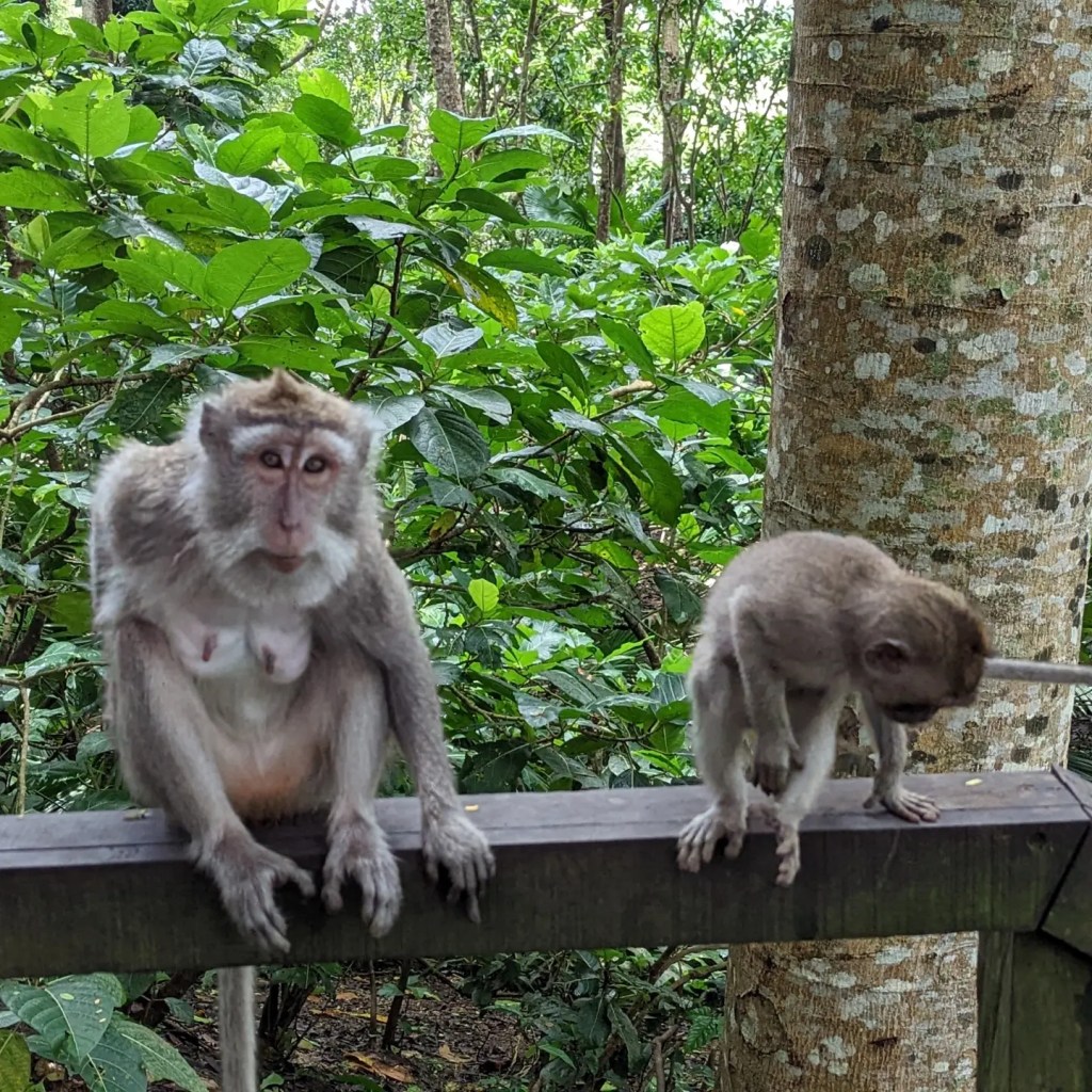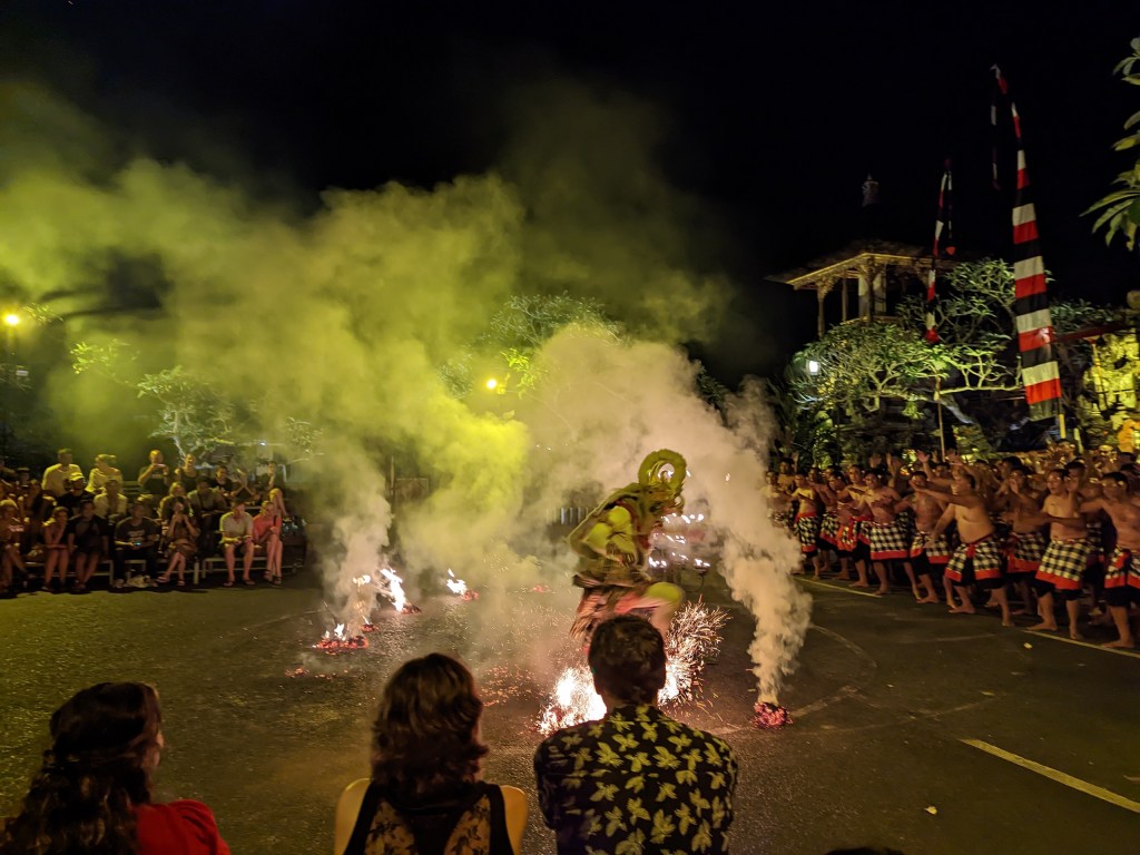 In the evening we went to the kecak fire dance at a local temple. It’s easy to get tickets because there are people selling them on the street around Ubud Palace and I think there’s at least one show happening around Ubud each night. I maybe thought as we were buying the tickets on the street that it was 50/50 on being a scam….but I was delightfully surprised to actually get to see a show! The show itself involved less fire than I expected but it featured beautiful dancing, a large group of men impressively performing all the music acapella for the show, and a fun performance and fire dance by the monkey general Hanuman. I thought it was a fun way to experience some more Balinese culture.