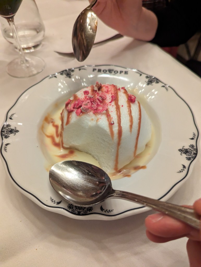 Le Procope – A couple of my friends go here at least once basically every time they’re in Paris and I can see why! This restaurant, which claims to be the oldest cafe in the world, and opened its doors in 1686. Apparently it did not continuously operate as the Procope, which some argue means they can’t maintain the “oldest” claim. Nevertheless, this was a place frequented by some of the most famous writers, philosophers, and leaders in history including Napoleon Bonaparte, Benjamin Franklin, Voltaire, and Victor Hugo. You can even if you look around see some amazing artifacts on display including one of Napoleon’s hats. If the historical context isn’t enough to tempt you to go, then definitely go for the food! Everything I had in my three course meal was delicious and the service was great. I particularly enjoyed having Œufs à la neige (also known as Snow Eggs or Floating Islands) for dessert – this is a dish of meringues floating in a custard sauce and I ordered it whenever possible!